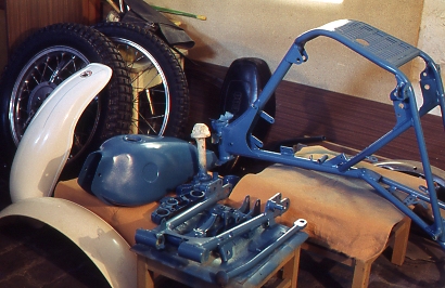 Mit 18 mußte natürlich ein Auto her und die Aspes wurde verkauft. Durch Zufall ergab sich sich jedoch die Gelegenheit eine gebrauchte 250er Bultaco Alpina zu kaufen. Die Maschine war aber reparaturbedürftig. Deshalb verschwand sie während der Wintermonate im Keller und wurde komplett neu aufgebaut. |